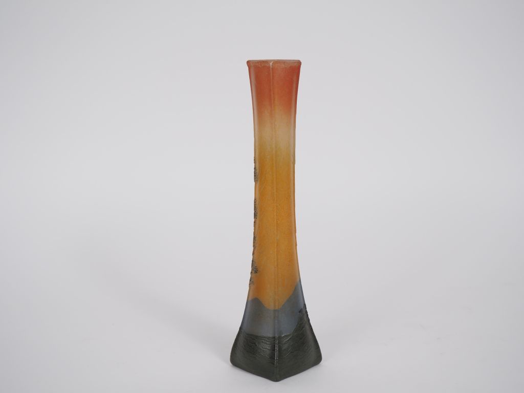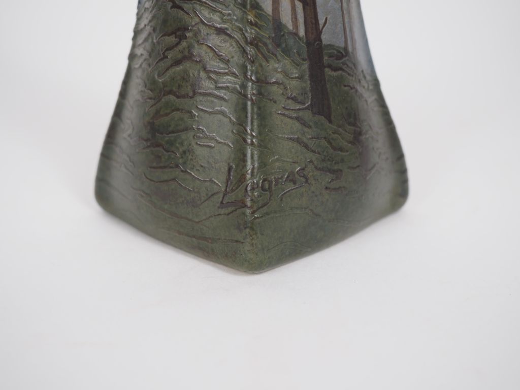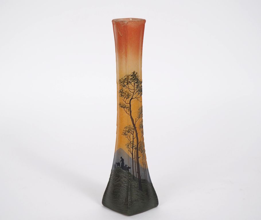 LEGRAS. Vase soliflore en verre, à décor émaillé et dégagé à l'acide de pastorale. Signé. H. 24 cm. (défaut de cuisson)