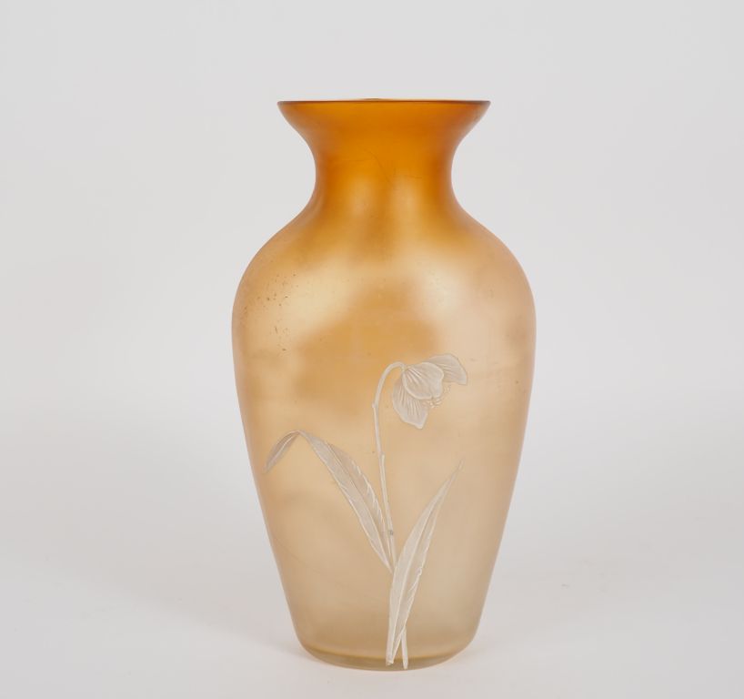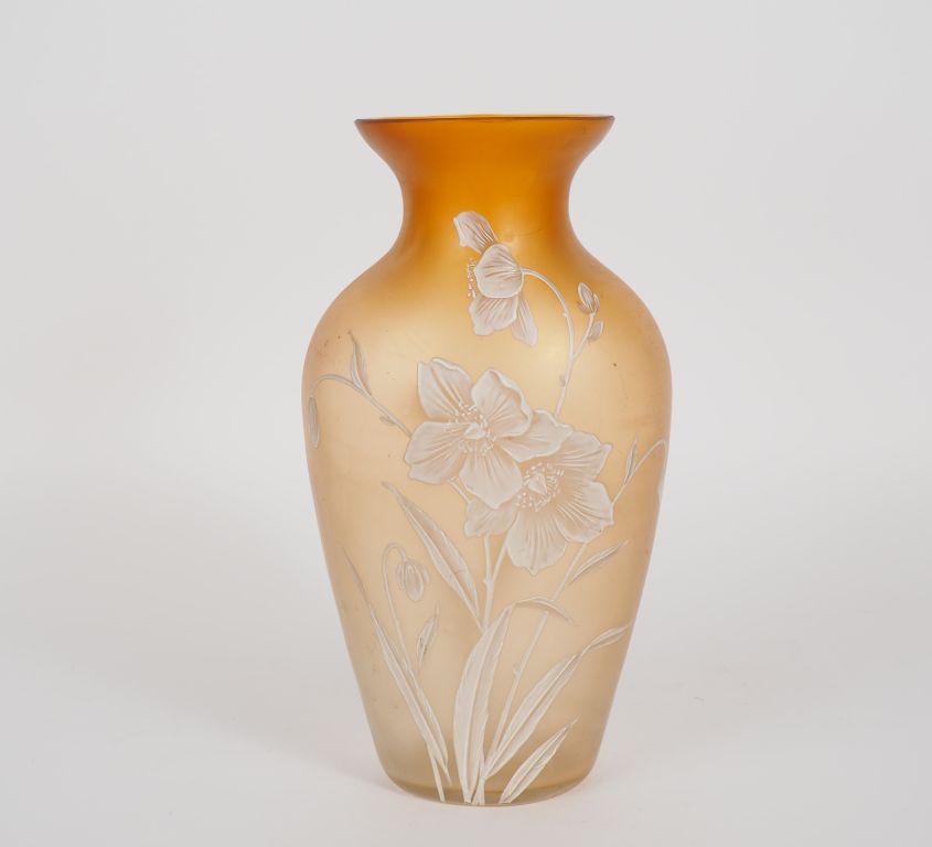 MULLER CROISMARE. Vase en verre à décor émaillé de fleurs blanches. Signé. H. 35 cm.