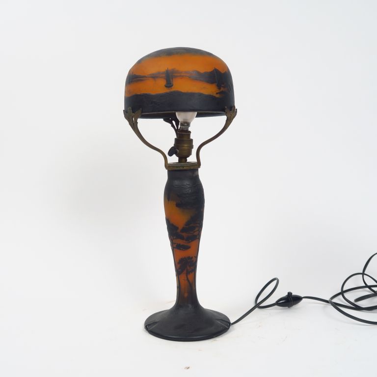 MULLER FRERES. Lampe en verre gravé et camée à l'acide à décor de paysage lacustre noir et mauve sur fond orangé. H. 45,5 cm