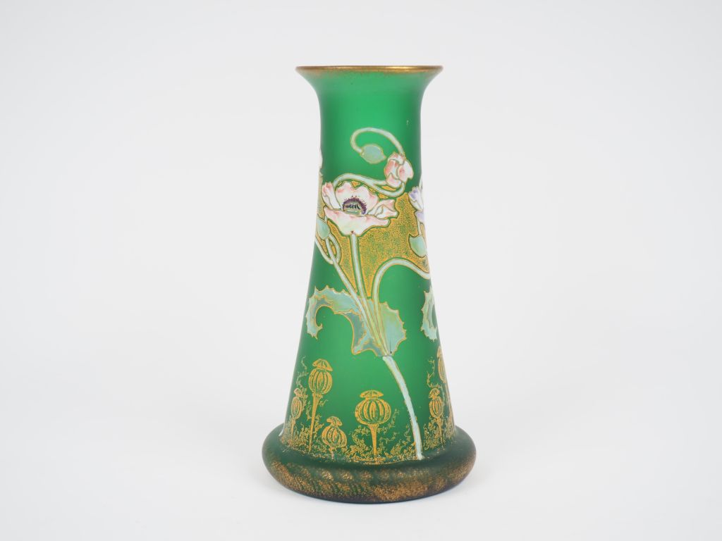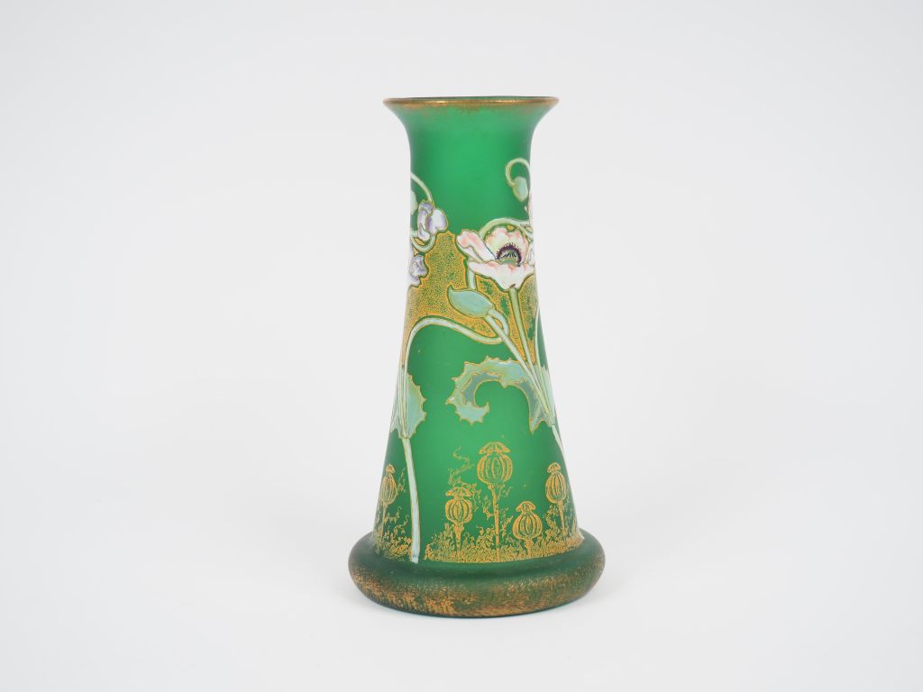 Vase 1900 en verre émaillé à décor polychrome de pavots sur fond vert, réhaussé d'or. H. : 26 cm.