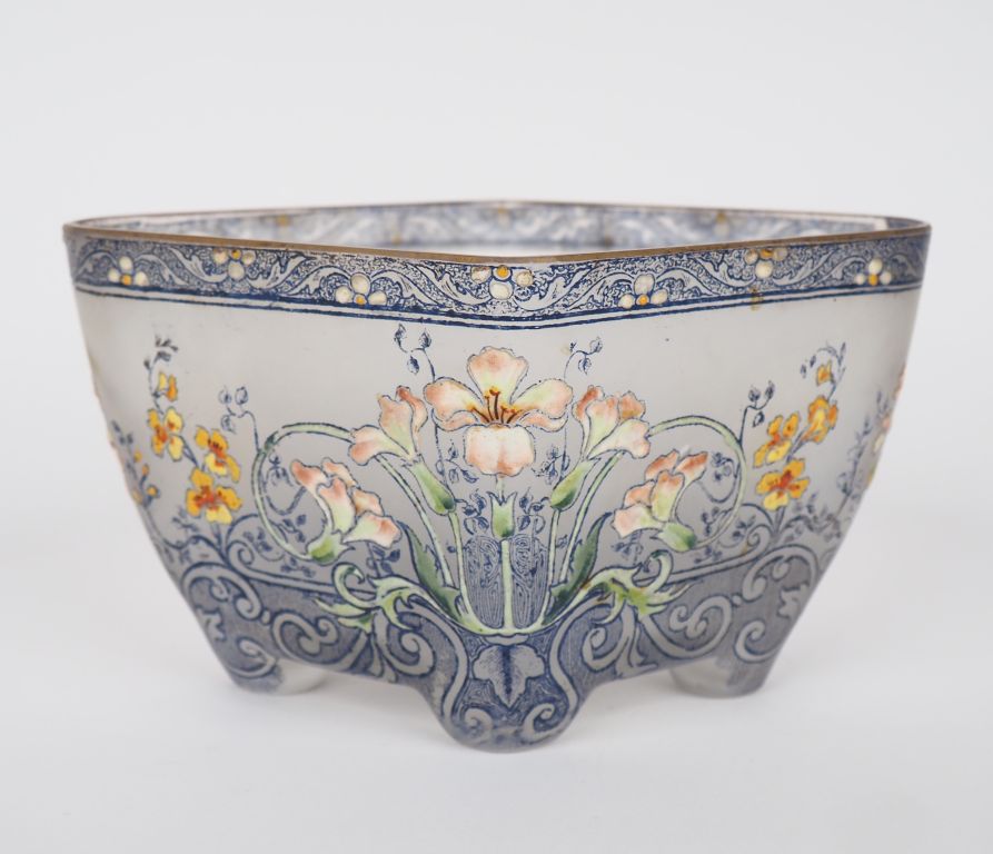 Vide poche Art Nouveau 1900 en verre émaillé à décor de fleurs polychromes et de rinceaux feuillagés. Dim. 10 x 16,5 cm