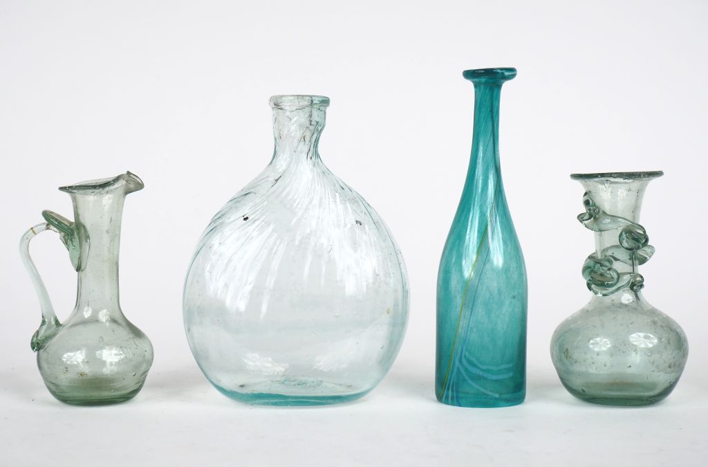 2 vases soliflores, une bouteille miniature, une verseuse miniature en verre. H. 9 à 12,5 cm.