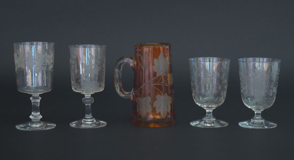 4 différents verres à pied en cristal gravé à décor de fleurs et de monogrammes. On y joint un chope en verre ou cristal bicolore à décor gravé de feuillage.