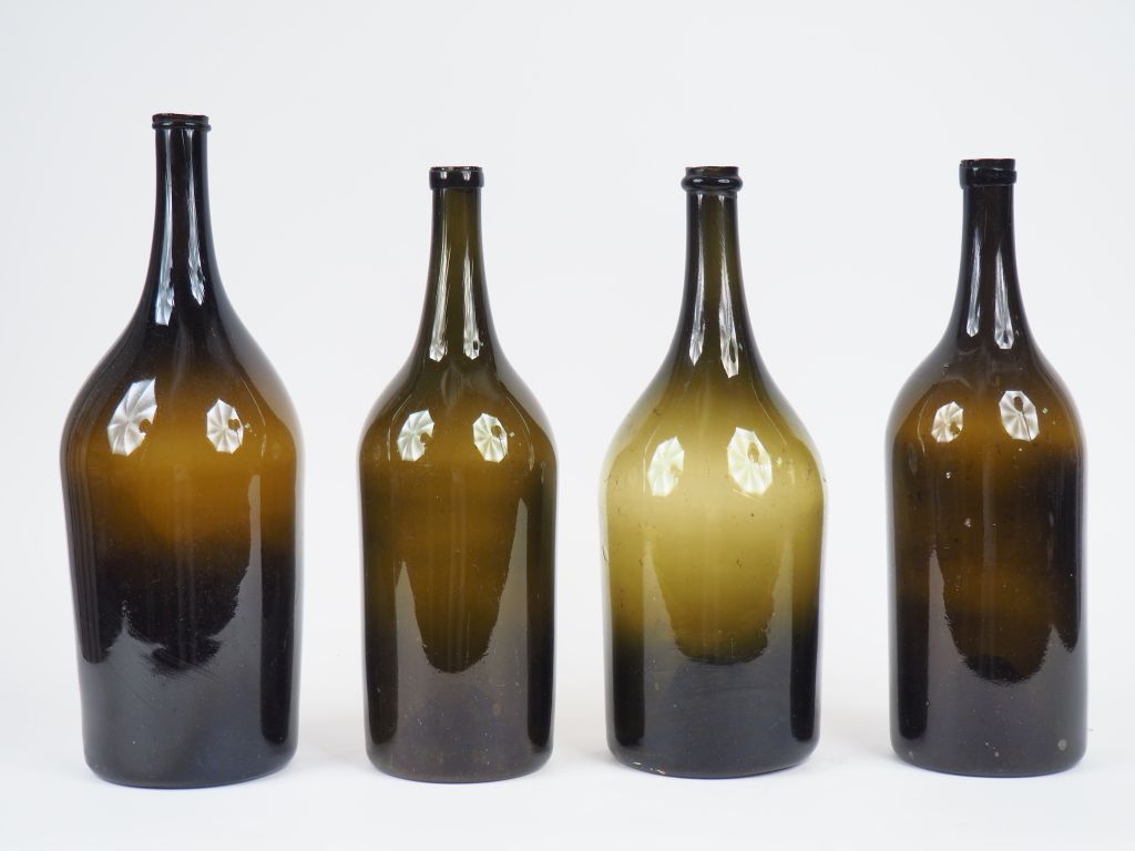 4 grandes bouteilles XIXème en verre fumé soufflé. H. 41 cm et 38 cm