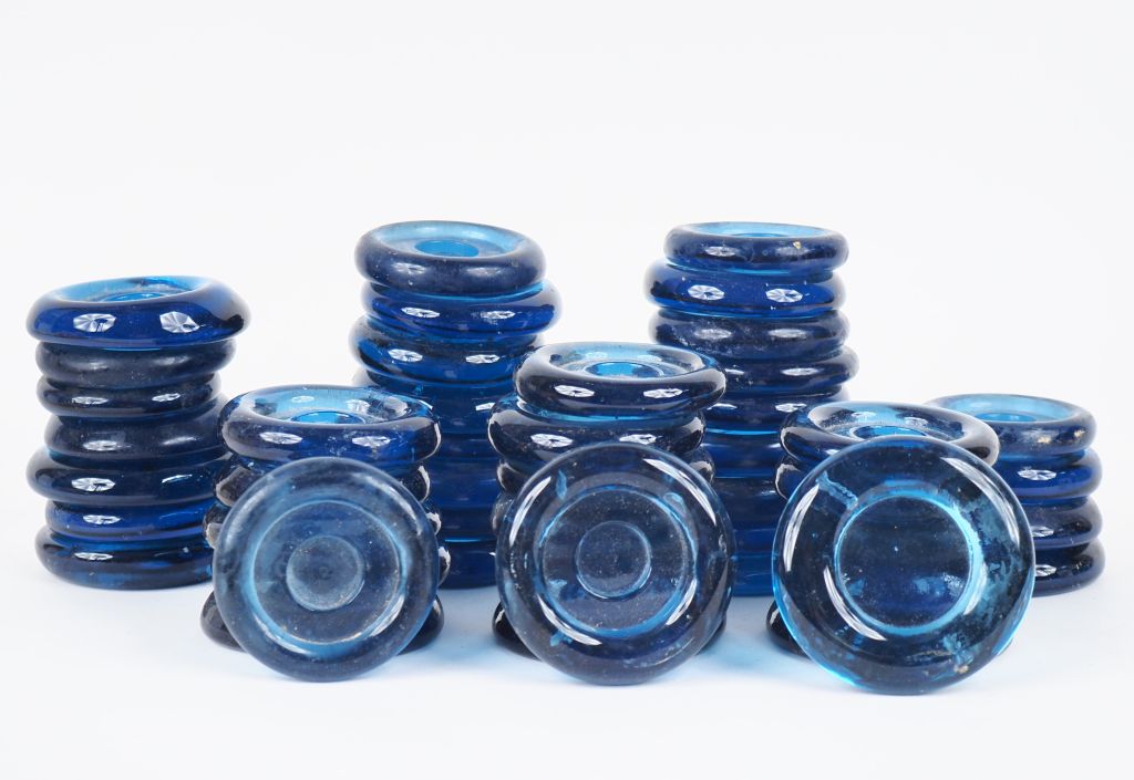 Lot de 44 supports ou disques en verre soufflé teinté bleu. Diam. Environ 7 c au prix de 40 à 60 € en vente aux enchères par l'hôtel des ventes Primardeco
