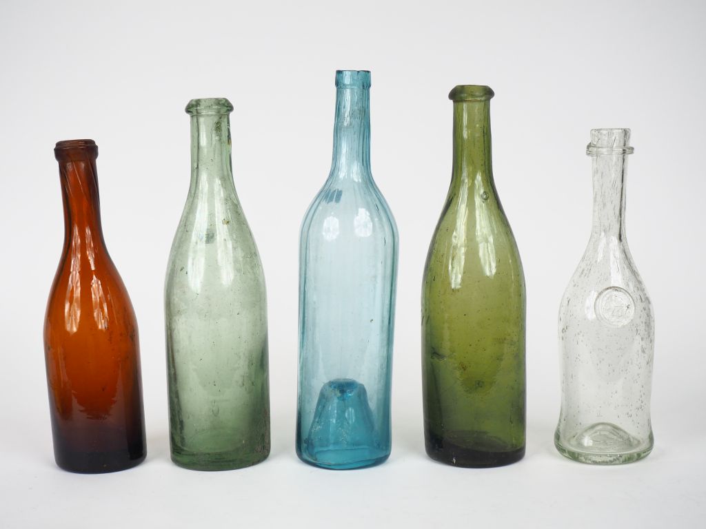 5 différentes bouteilles en verre soufflé. H. de 25,5 à 30 cm.