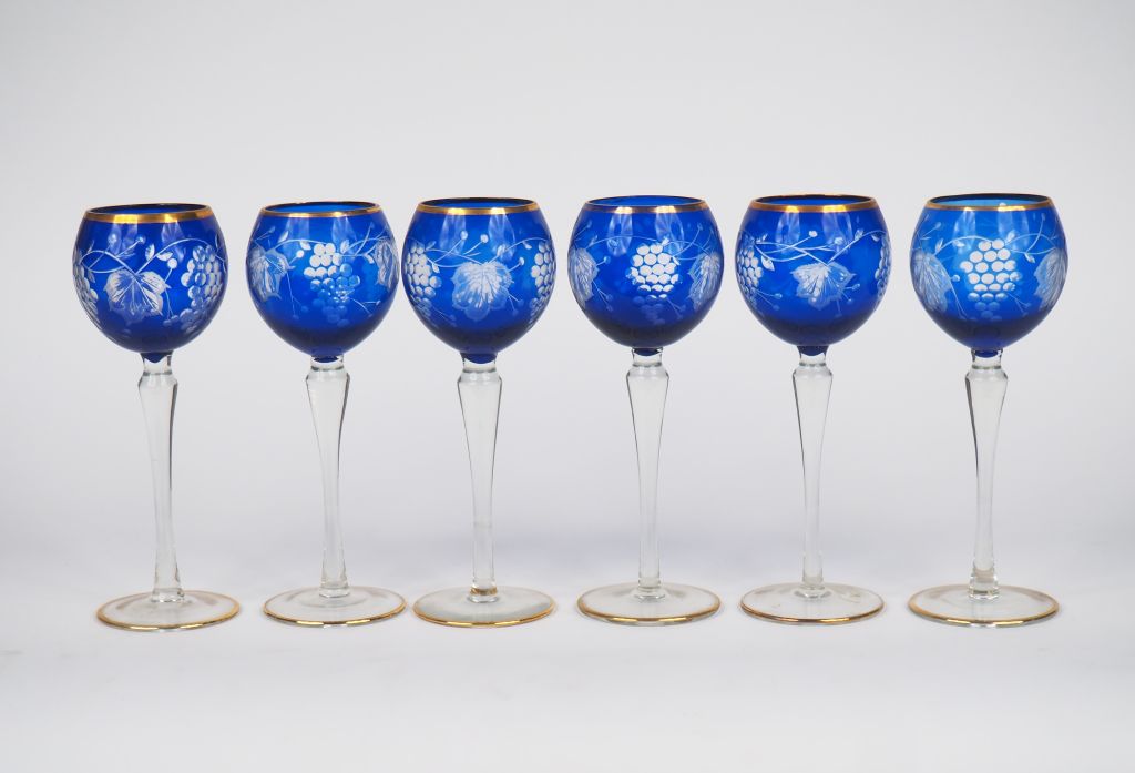 Lot de 6 verres à vin du Rhin à décor gravé de pampres. H. 22,5 cm. au prix de 30 à 40 € en vente aux enchères par l'hôtel des ventes Primardeco