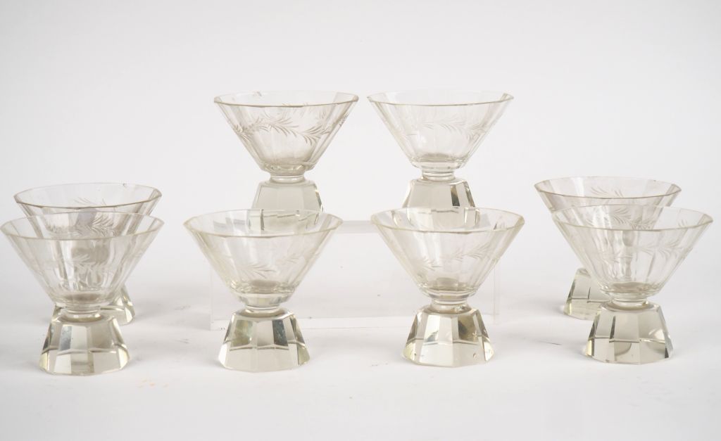 8 coupes à champagne de style Art Déco, modèle à facettes, décor gravé de feuillage. (égrenures)