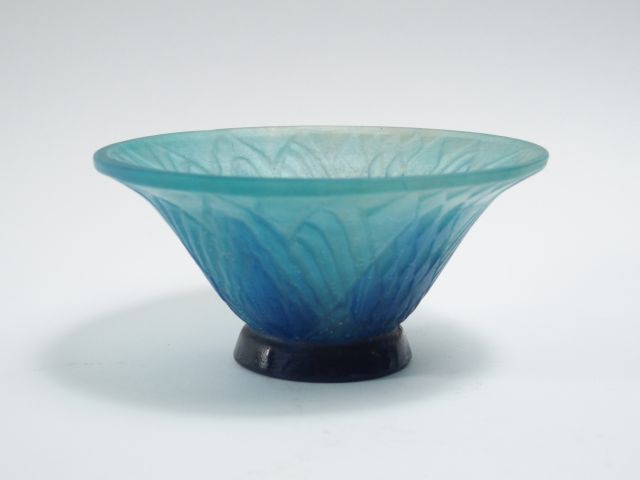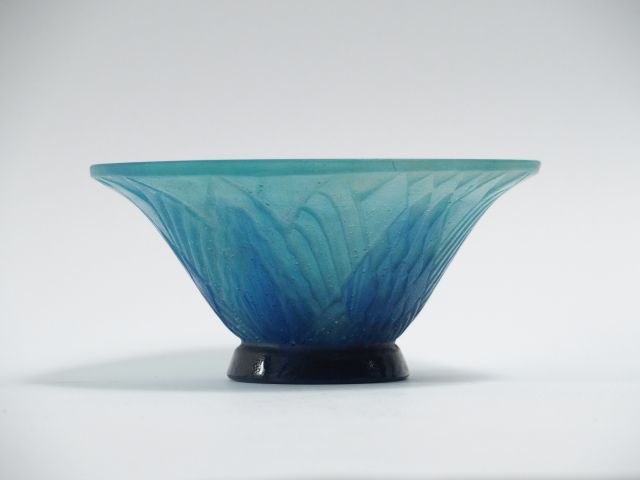 A. WALTER à Nancy. Coupe en pâte de verre à deux tons de bleu, à décor de feuillage stylisé. H. : 8 cm, Diam. : 16,5cm. Signée.