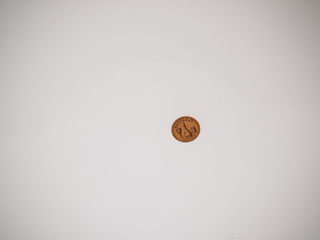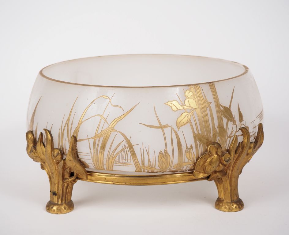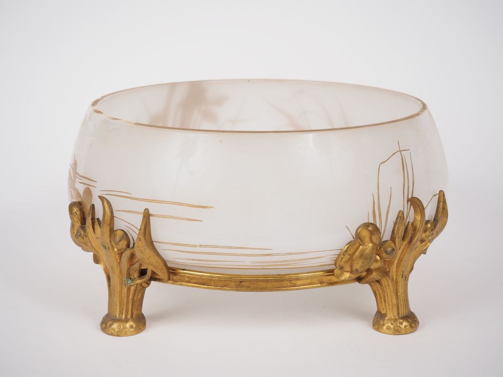 BACCARAT. Coupe en opaline blanche à décor doré et émaillé de roseaux et de végétation aquatique, monture en bronze doré à décor feuillagé. Etiquette ancienne de la maison Baccarat , signée sur la monture. Dim.16 x 30,5 cm (traces de griffures)