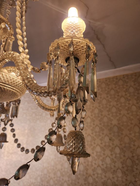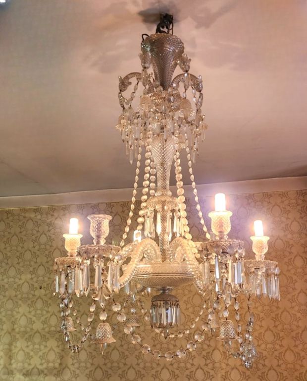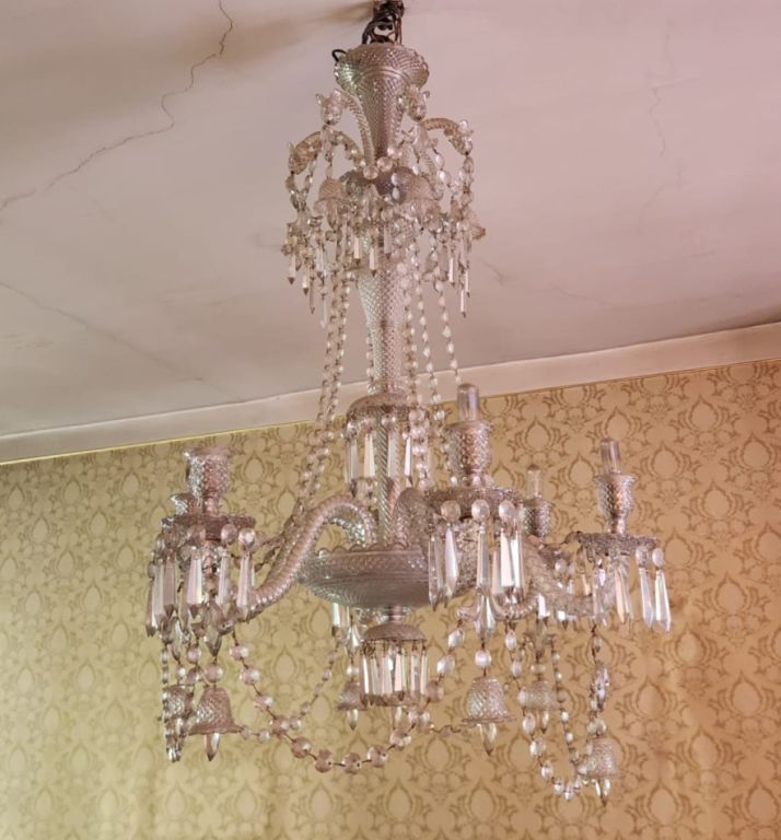 BACCARAT.(?) Lustre en cristal à décor de pampilles, éclairant à six lumières. H. 92 cm. (égrenures) VENTE SUR DESIGNATION (appartement situé au centre ville de Toulouse, premier étage, facile d'accès, stationnement facilité et possible pour l'enlèvement)