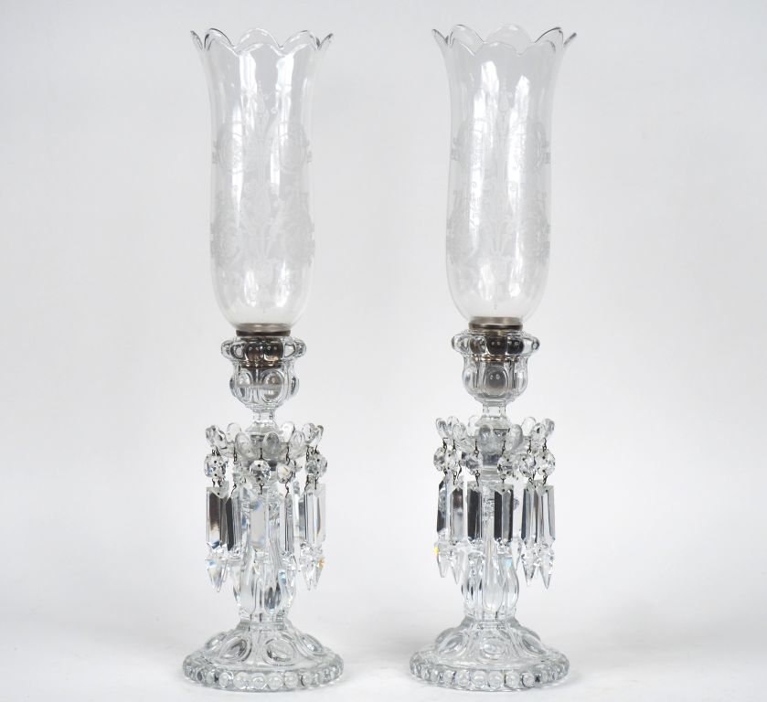 BACCARAT. Paire de photophores à pendeloques en cristal moulé et gravé à décor de rinceaux. H. 54,5 cm