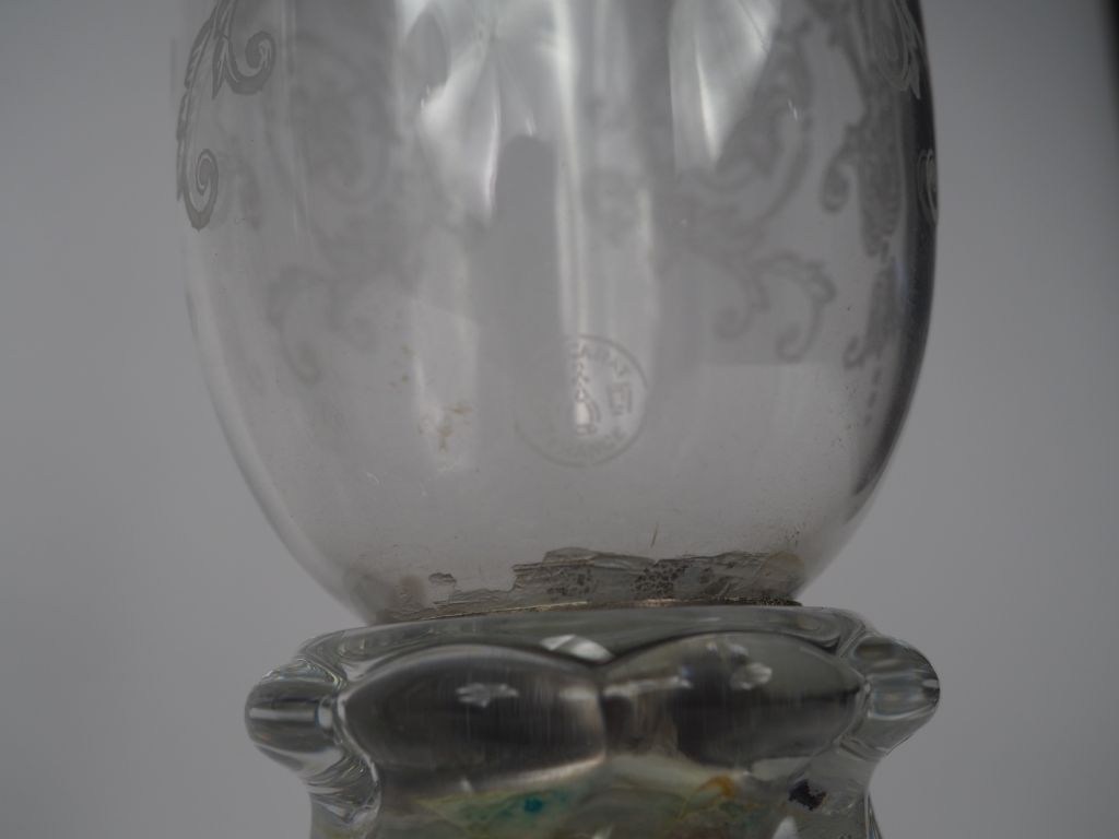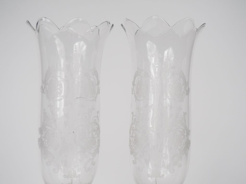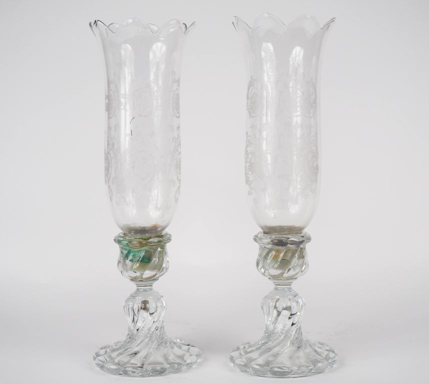 BACCARAT. Paire de photophores en cristal moulé et gravé, à décor de côtes torses et de rinceaux feuillagés. Signés H. 41 cm (une des tulipes félée)
