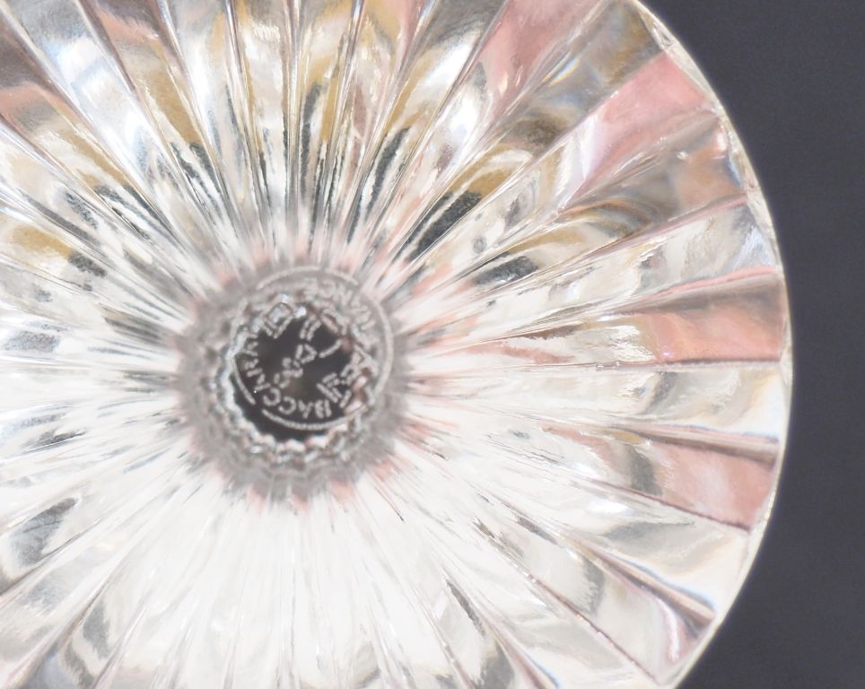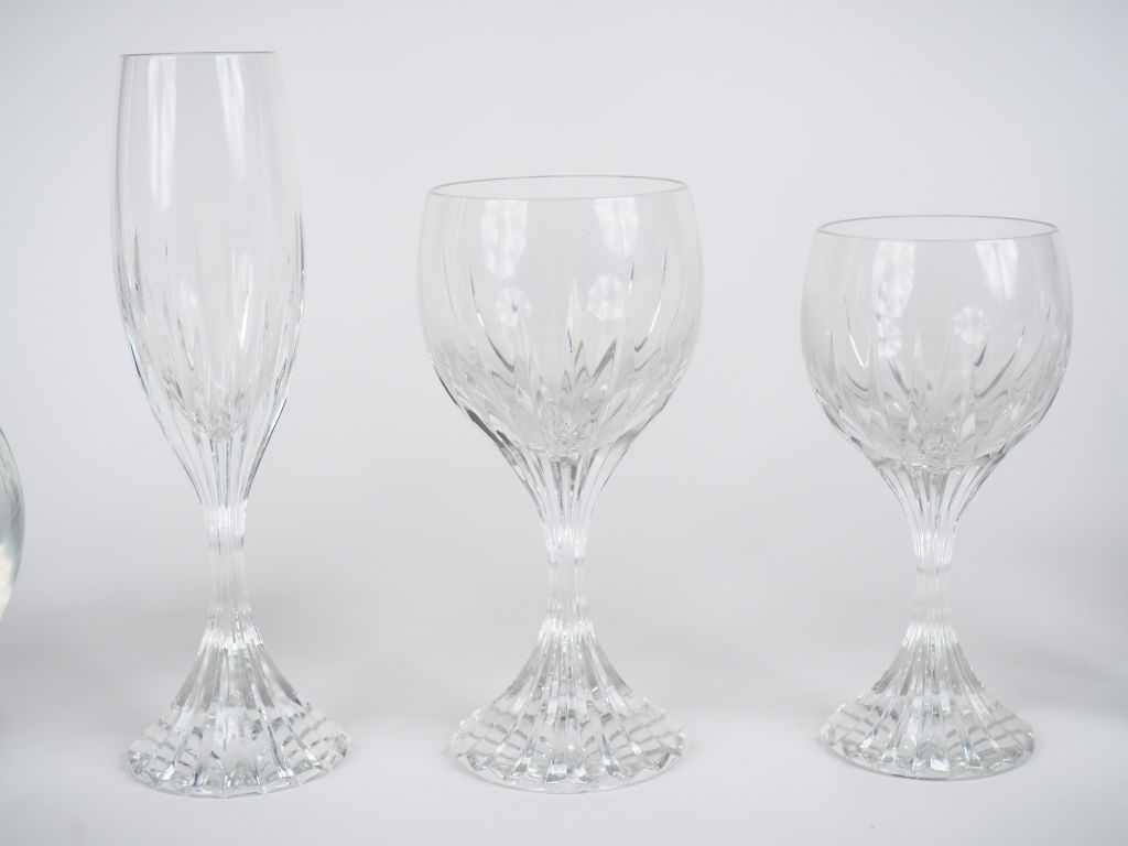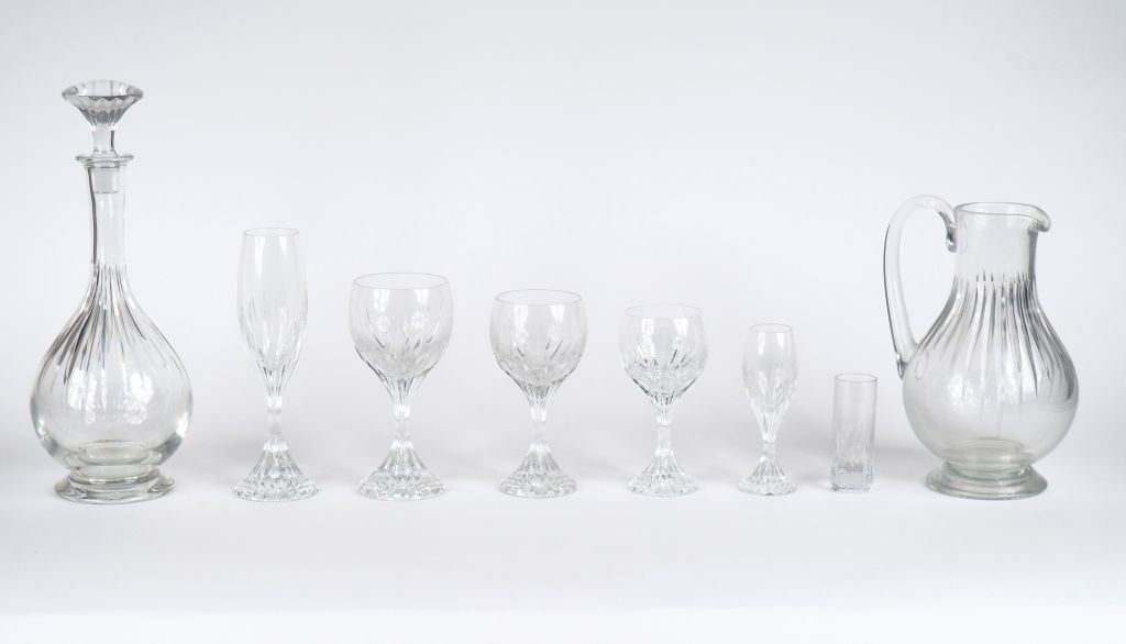 BACCARAT. Service de verres en cristal Signé. Comprenant : - 10 flûtes à champagne - 10 verres à eau - 10 verres à vin - 10 verres à Sauternes - 6 verres à liqueur - 1 flacon - 1 carafe (Petites égrenures).