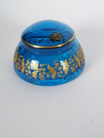 Bonbonnière en cristal de St Louis à décor doré sur fond bleu. Diam. D...
