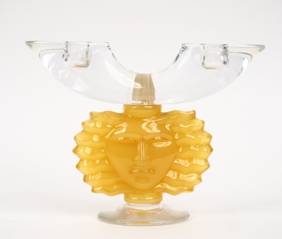 Bougeoir double bicolore en cristal jaune et translucide à décor de visage. H. 15,5 cm