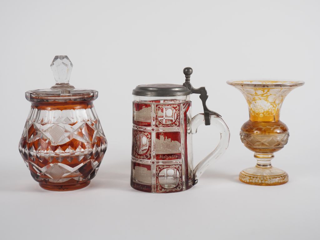 Chope autrichienne en verre de Bohème bicolore à décor taillé et gravé d'architectures. H. 13,5 cm. On y joint un sucrier et un vase soliflore en verre de Bohème. H. 11,5 et 16 cm.