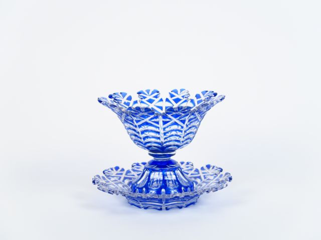 Coupe et son présentoir début Xxème en cristal bleu. (petites égrenure...