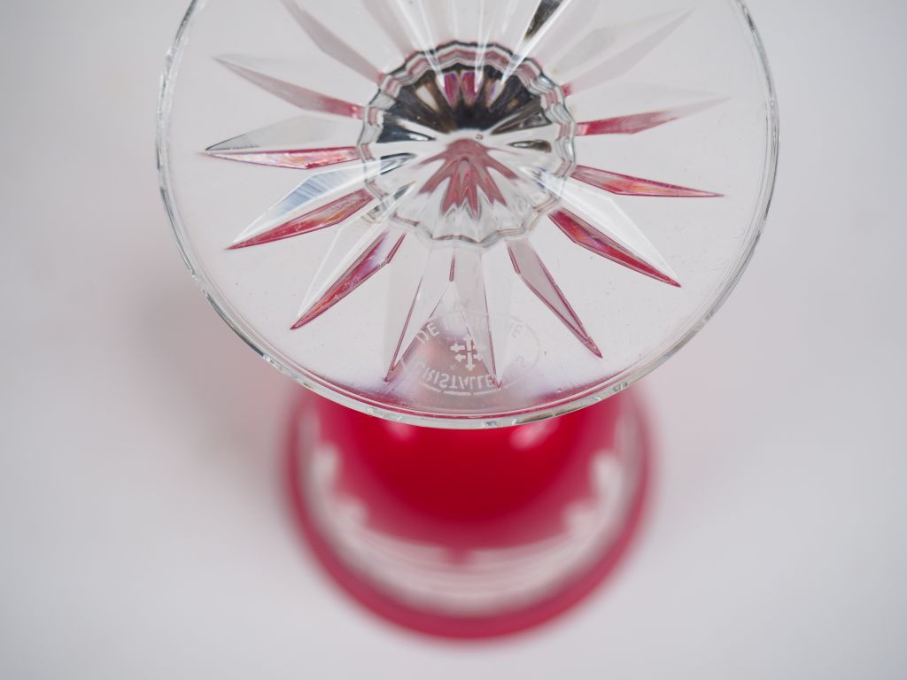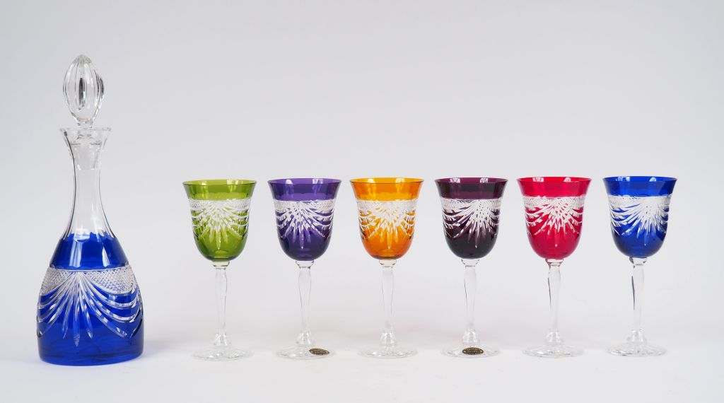 Cristallerie de Lorraine. Suite de six verres et un flacon en cristal bicolore. H. des verres : 20,5 cm H. du flacon : 35 cm
