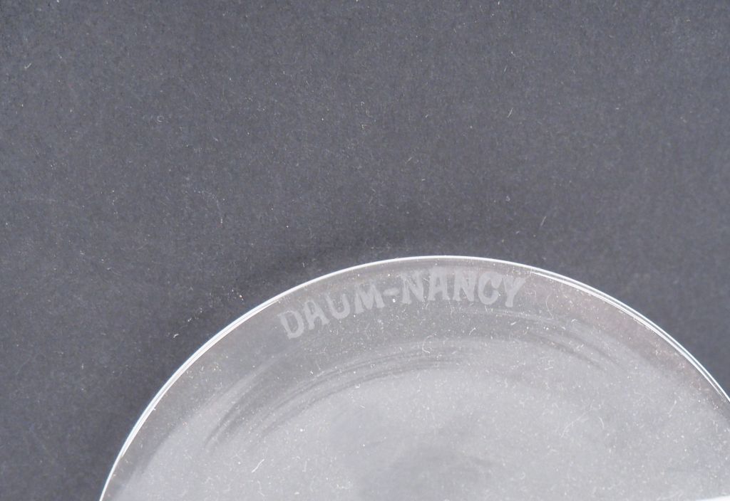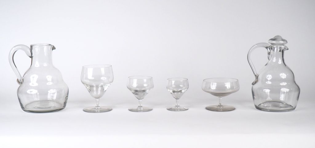 DAUM à Nancy. Partie de service de verres en cristal comprenant : - 6 verres à eau - 6 verres à vin rouge - 6 verres à vin blanc - 6 coupes à champagne - 1 carafe - 1 flacon Signé.