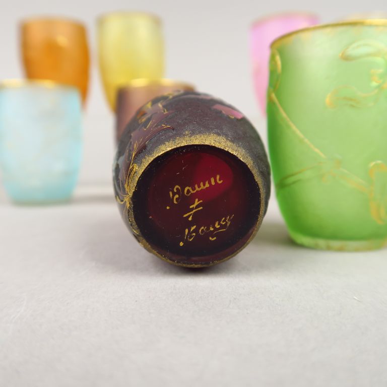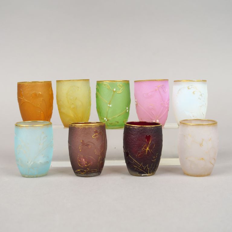 DAUM à Nancy. Suite de neuf verres en cristal, à décor émaillé doré de feuillage et de fleurs. Signés. H. 5 cm