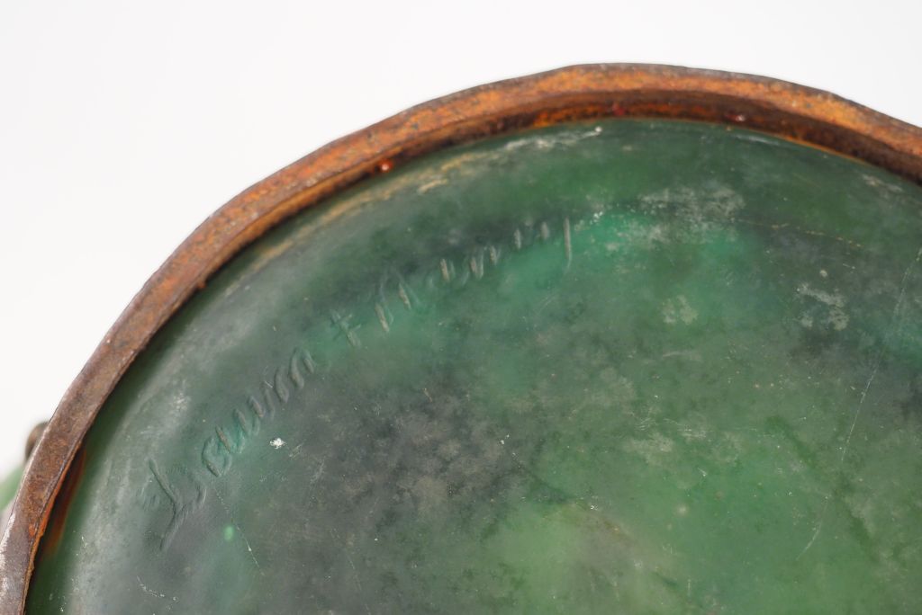 DAUM ET MAJORELLE. Vase balustre en verre jaspé soufflé vert pailleté d'or, monture en fer forgé. Signé . H : 21,8 cm.