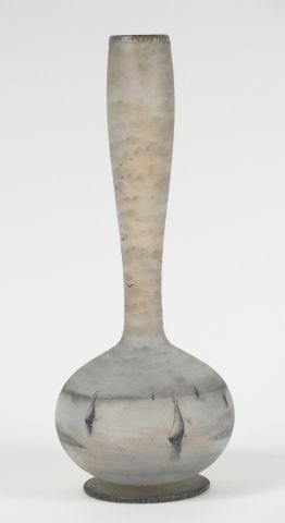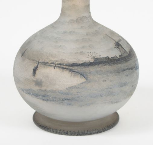 DAUM. Grand vase en verre, à décor gravé en grisaille de marine hollandaise sur fond bleuté. Signé. H. : 38.5 cm