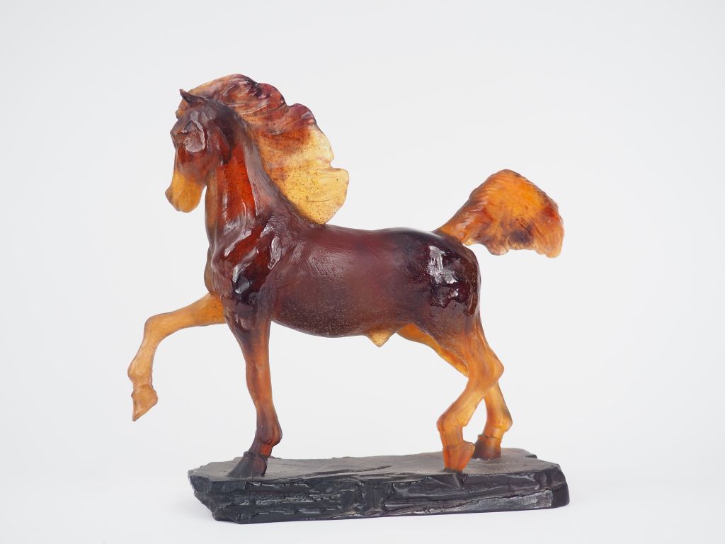 Lot de DAUM. Sculpture en pâte de verre ambrée « Cheval ». Signée H. 24 cm au prix de 150 à 200 € en vente aux enchères par l'hôtel des ventes Primardeco