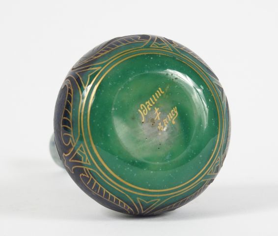 DAUM. Soliflore en verre, à décor gravé et émaillé en bleu et vert de fleurettes, rehauts de liserés dorés. Signé. H. : 17 cm