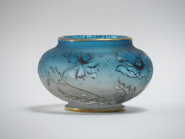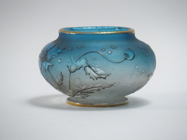 DAUM. Vase en cristal givré bleu nuit, à décor émaillé noir et doré de pavots. H. : 10 cm. Signé.