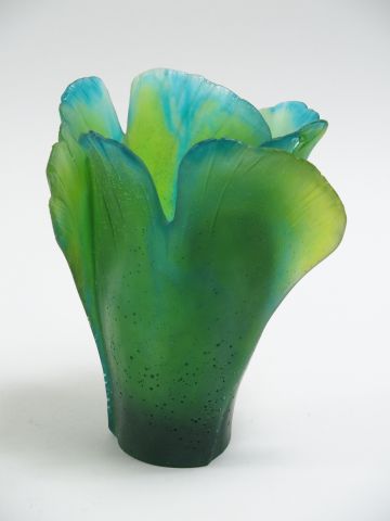 Lot de DAUM. Vase en pâte de verre verte et bleue en forme de fleur (égrenure au prix de 150 à 200 € en vente aux enchères par l'hôtel des ventes Primardeco