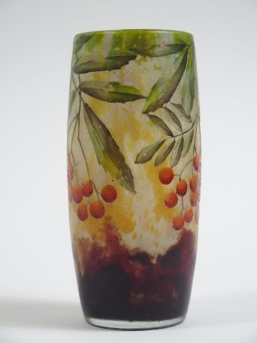 DAUM. Vase en verre à décor émaillé de baies orange et vert. H. : 11 c...