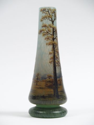 DAUM. Vase en verre, à décor émaillé de paysage d’automne. H. : 21,5 cm. Signé.