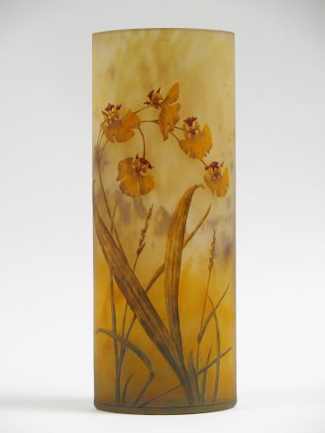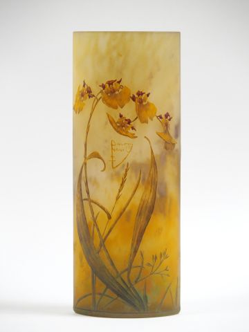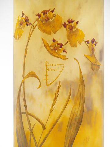 DAUM. Vase en verre, à décor émaillé d’orchidées sauvages jaune orangé et brun sur fond jaune nuancé. H. : 30,5 cm Signé.