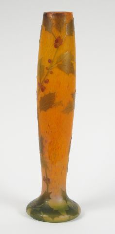DAUM. Vase en verre, à décor gravé et émaillé de houx sur fond orangé. Signé. H. : 46.5 cm