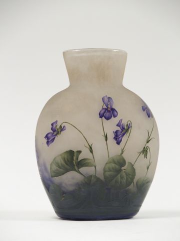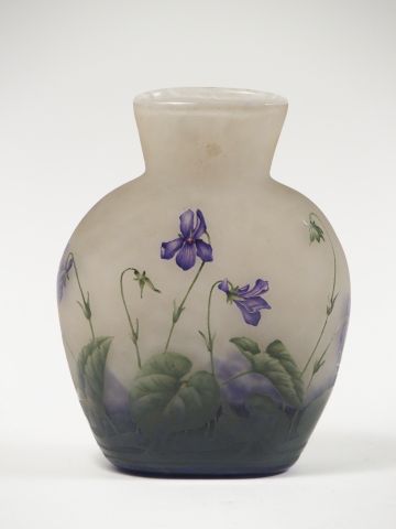 DAUM. Vase en verre émaillé, à décor de violettes sur fond marbré blanc nuancé de bleu. H. : 20 cm. Signé. (micro égrenure à la base)