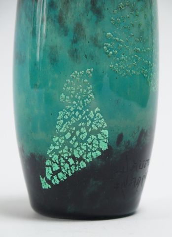 DAUM. Vase en verre marbré bleu nuancé et inclusions d’argent. H. : 12,5 cm. Signé.