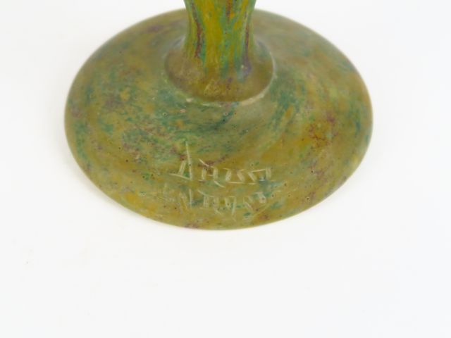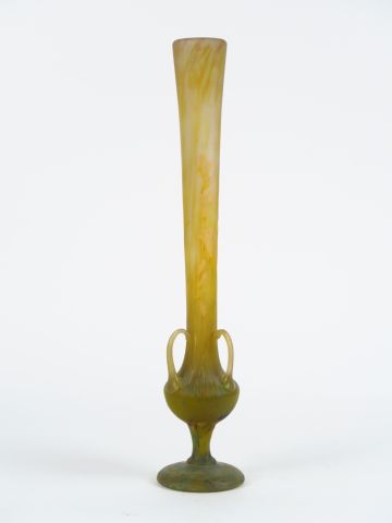 DAUM. Vase soliflore en verre à décor gravé et émaillé de fleurs blanches sur fond vert moucheté , trois anses appliquées à chaud Signé H. 46,5 cm