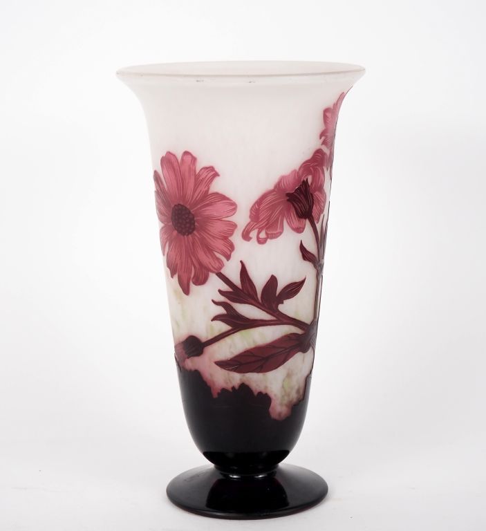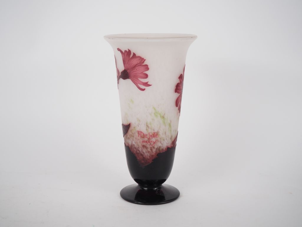 DELATTE à Nancy. Vase en verre à décor gravé en camée et à l'acide de fleurs mauves sur fond blanc moucheté. Signé H. 25,5 cm