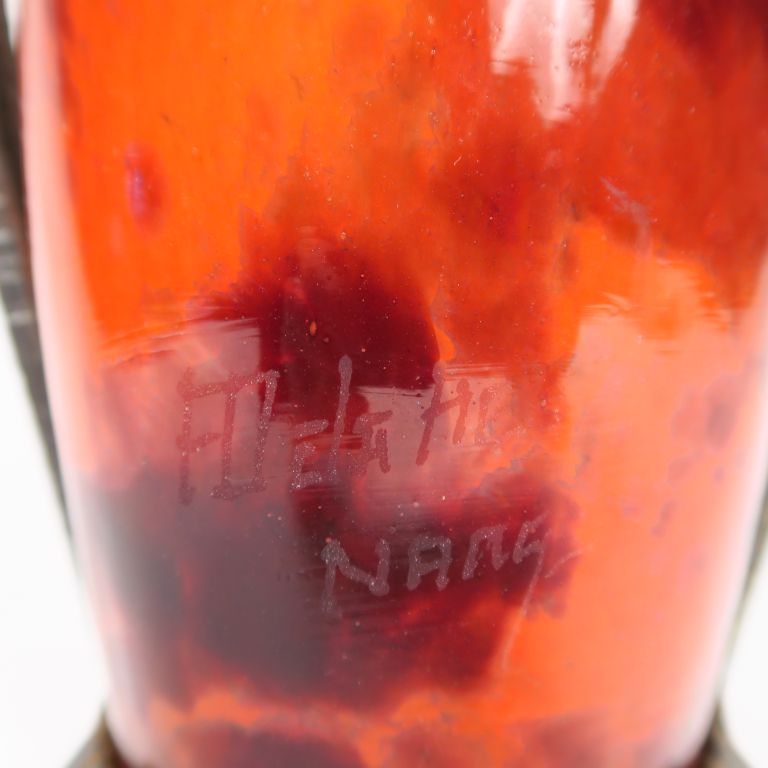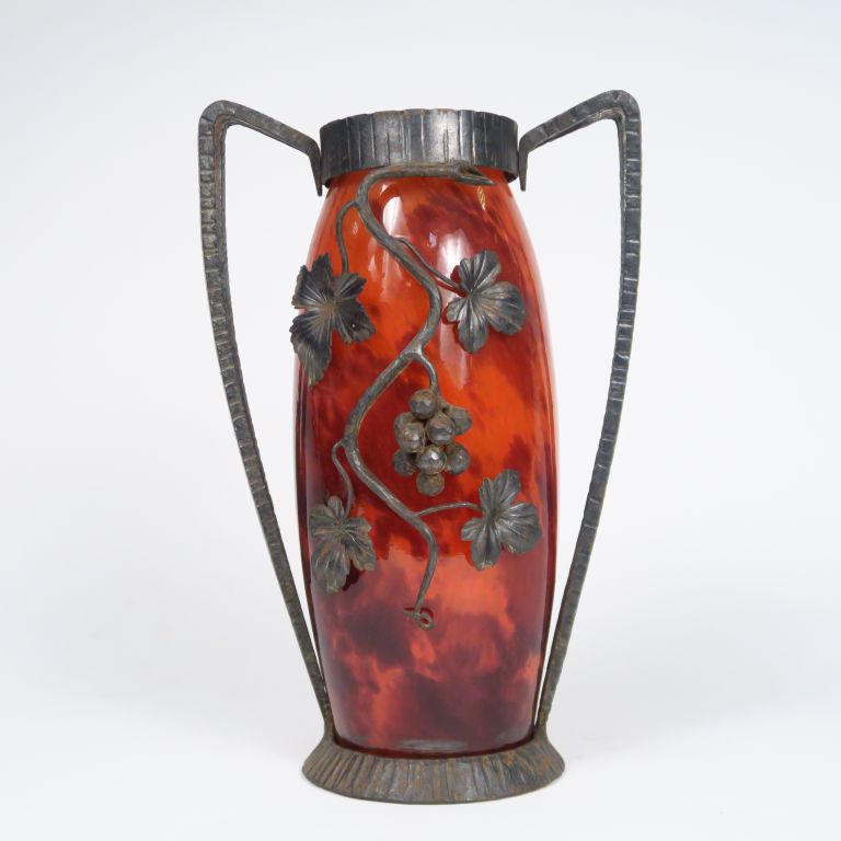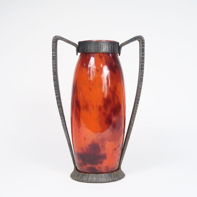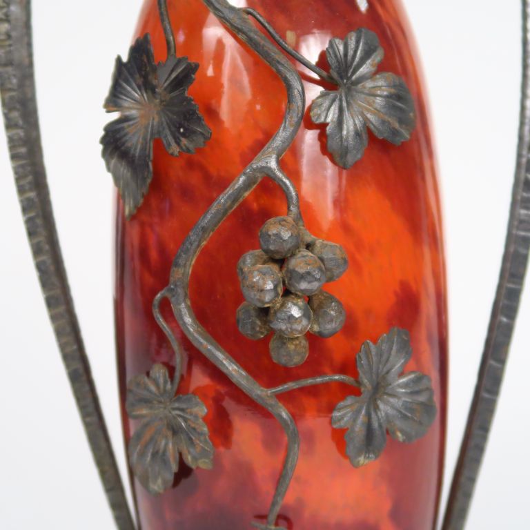 DELATTE. Vase en verre poudré orange, monture en fer forgé à décor de pampres. Signé. H. : 32,5 cm.