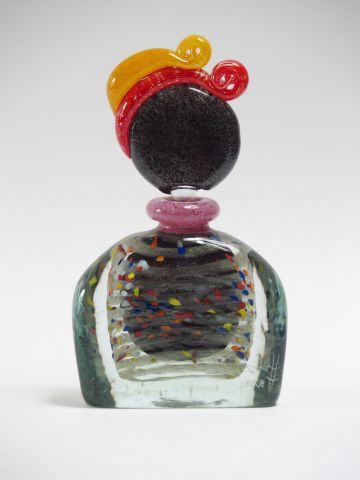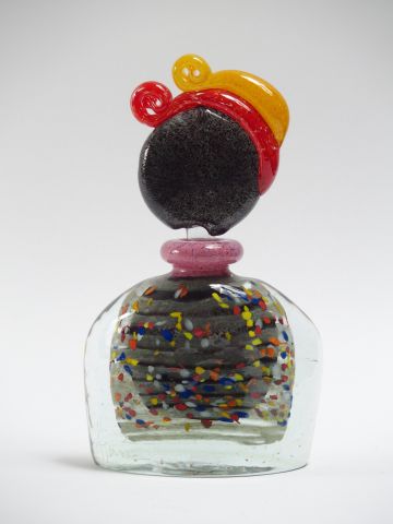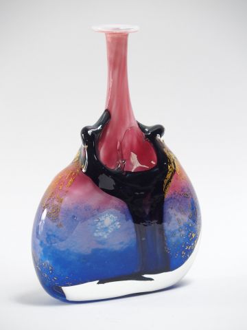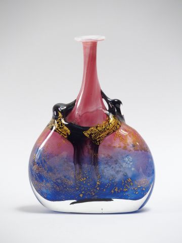 Deux différents flacons en verre polychrome à décor d'inclusions et d'applications à chaud. On y joint un vase en cristal bleu.