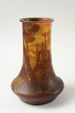 Lot de DEVEZ. Vase en verre gravé en camée à l'acide à décor de paysage lacus au prix de 100 à 150 € en vente aux enchères par l'hôtel des ventes Primardeco