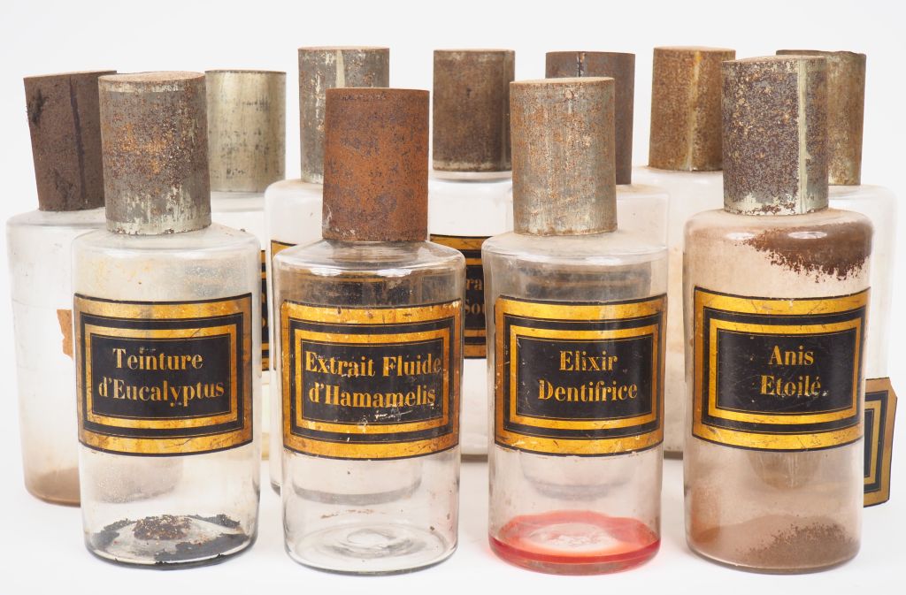 Lot de Ensemble de 39 pots de pharmacie en verre et tôle, étiquette noire et au prix de 200 à 300 € en vente aux enchères par l'hôtel des ventes Primardeco