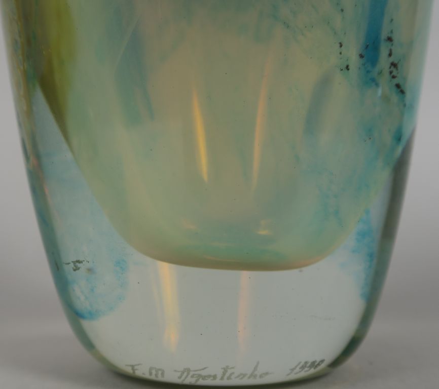 F.M AGOSTINO. Flacon ovoïde et son bouchon en verre, à décor nuageux sur fond vert d'eau. Signé et daté 1990. H. 27,5 cm