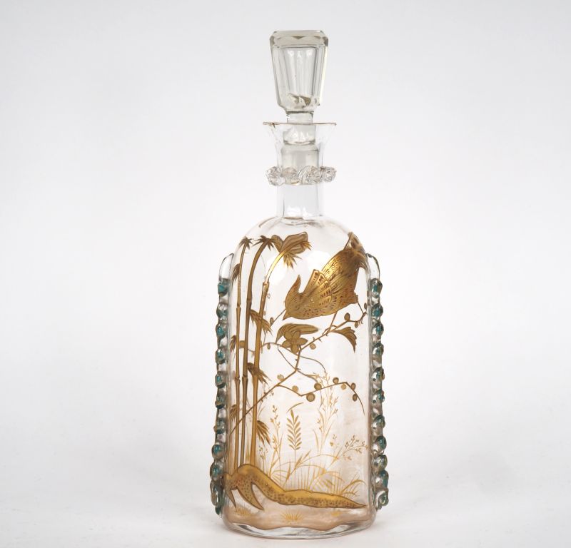 Flacon 1900 en cristal émaillé à décor doré d'oiseaux et de bambous.
