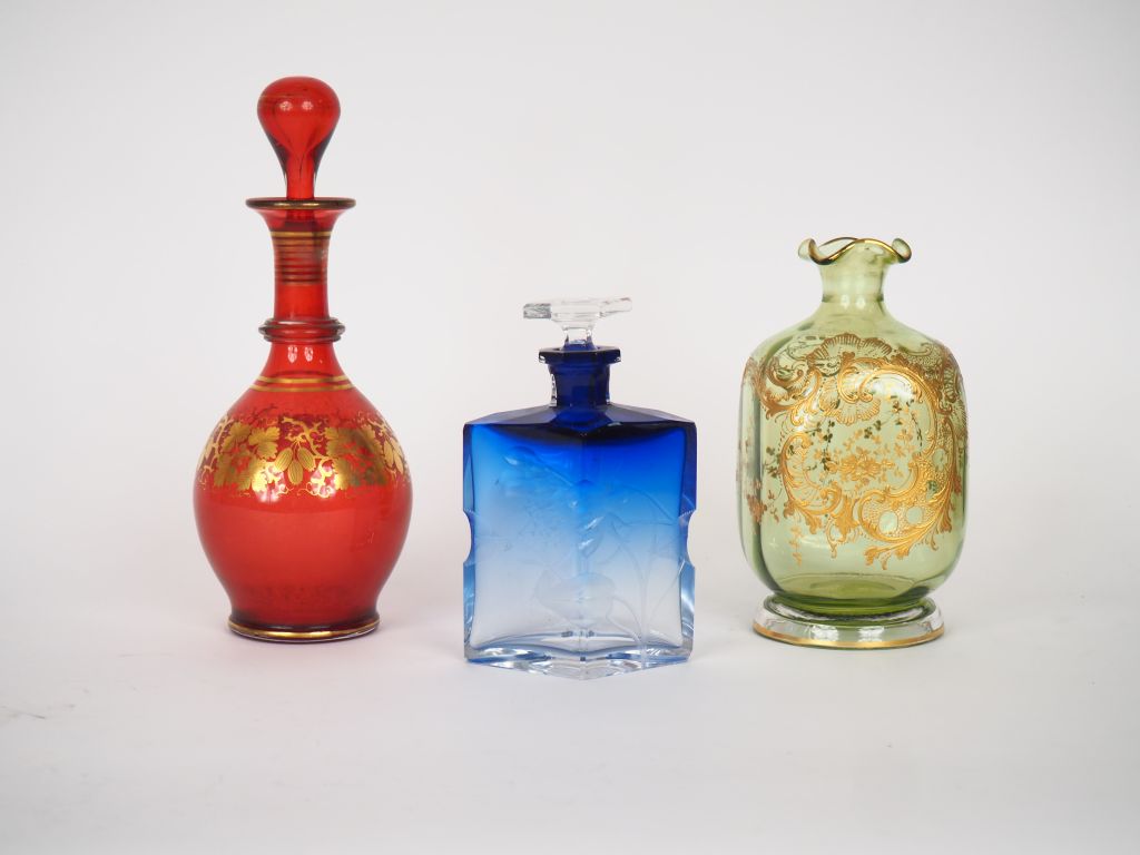 Flacon de style Art Déco en cristal bicolore à décor gravé de fleurs. Flacon en cristal vert à décor émaillé et doré de rocaille et de fleurs. Flacon Napoléon III en cristal rubis orné d'une frise de feuillage doré