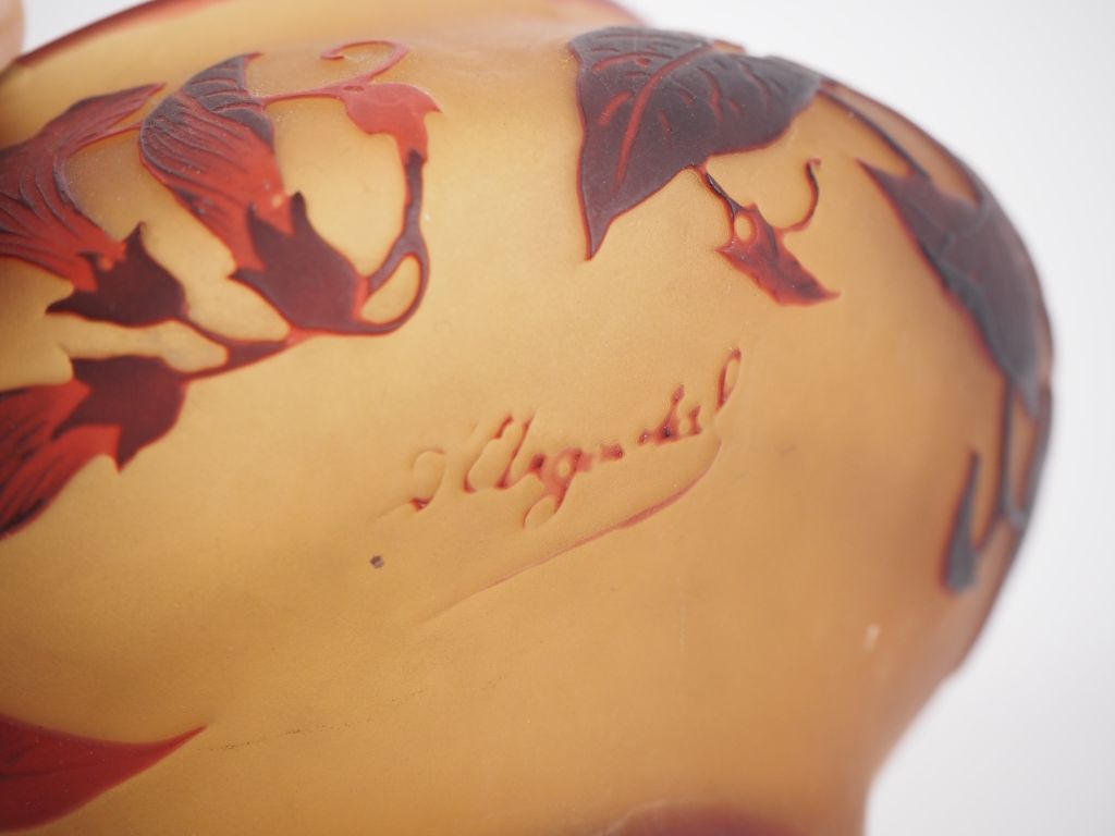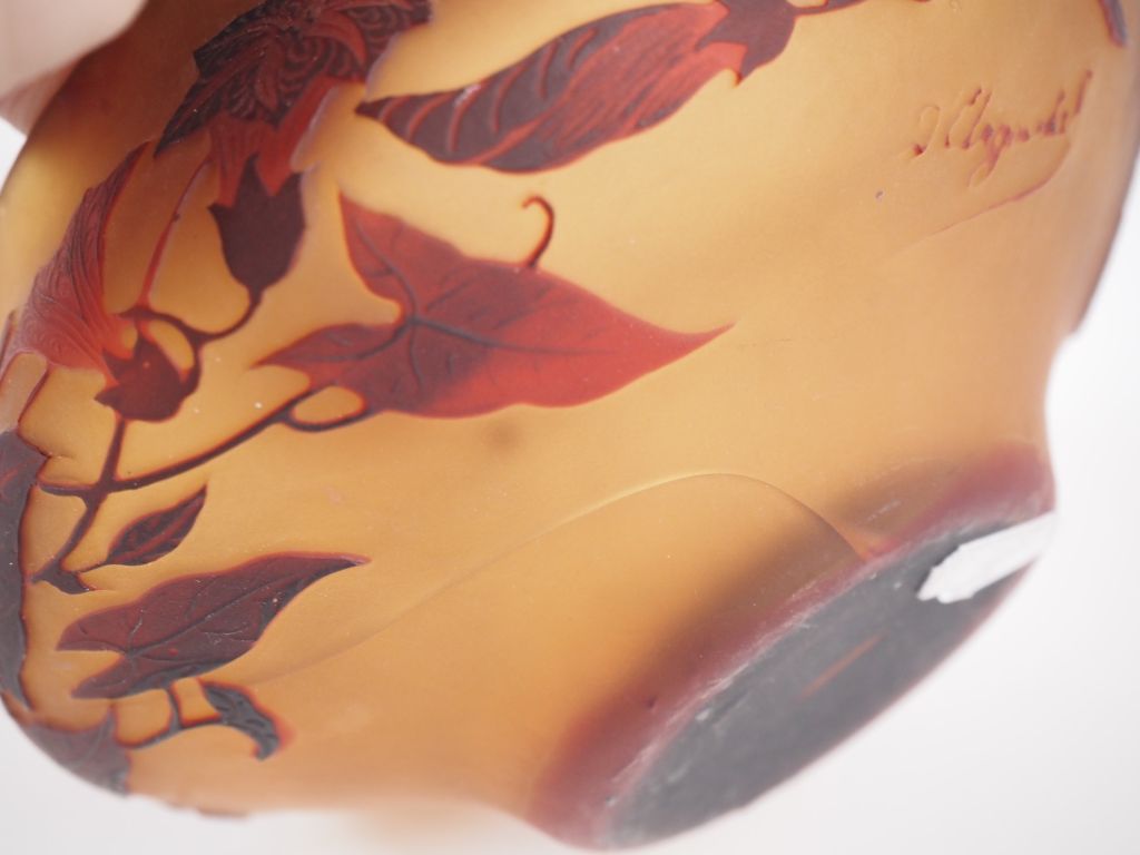 Flacon début XXème en verre de Lorraine à décor gravé en camée et à l'acide rouge et jaune de paysage lacustre et de fleurs. H. 13,5 cm D'ARGENTAL. Coupe en cristal à décor gravé en camée et à l'acide de bignones rouges sur fond orangé Signée Fel H. 7,5 cm