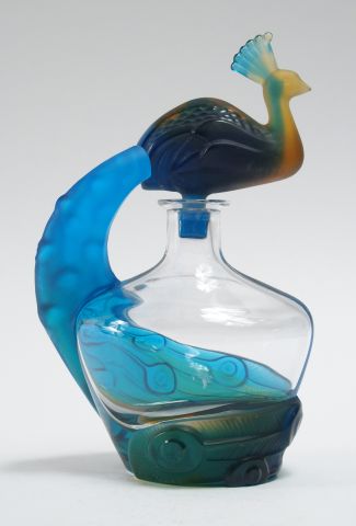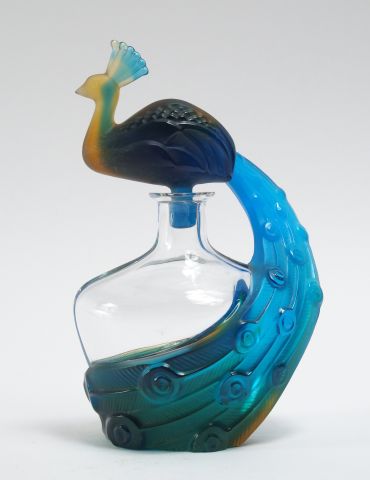 Lot de Flacon en cristal translucide et bicolore, à décor de paon. H. : 16 cm au prix de 80 à 100 € en vente aux enchères par l'hôtel des ventes Primardeco