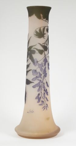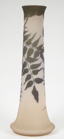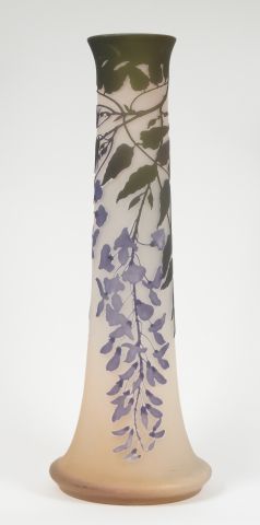 GALLE. Grand vase en verre, à décor gravé en camée et à l’acide de glycine mauve et de feuilles vertes sur fond blanc rosé. Signé. H. : 63.5 cm