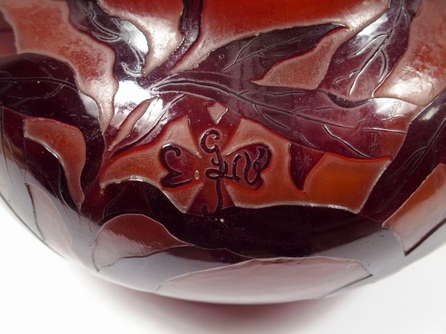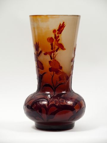 GALLE. Grand vase en verre, à décor gravé en camée et à l'acide et lustré de fleurs en camaïeu orange et brun. Signature japonisante. H. : 42 cm